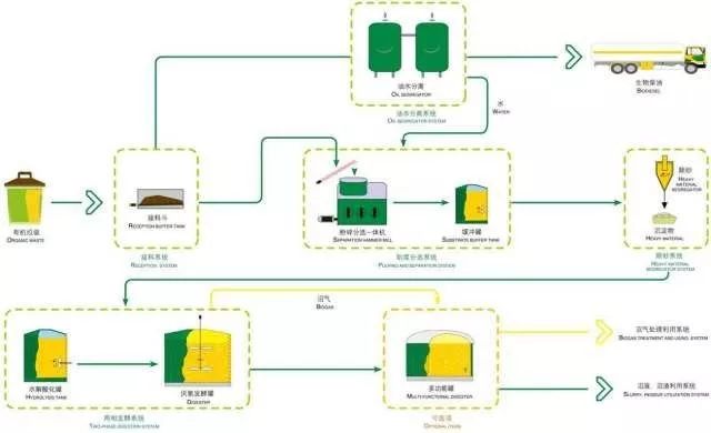 厭氧發(fā)酵技術(shù)的優(yōu)點是垃圾的減量化,資源化處理效果好,產(chǎn)生的沼氣發(fā)電可作為新能源補充現(xiàn)有常規(guī)能源。厭氧發(fā)酵過程中無臭氣逸出,發(fā)酵后不會產(chǎn)生二次污染,社會大眾的接受程度較高。由于餐廚垃圾的厭氧降解過程主要是在密閉的反應(yīng)器(發(fā)酵罐)中進行的,因此反應(yīng)器的運行參數(shù)會直接影響到厭氧發(fā)酵的過程。按照反應(yīng)器運行的技術(shù)參數(shù),厭氧工藝可分為:中溫工藝與高溫工藝(按照反應(yīng)器內(nèi)溫度劃分);單相工藝與兩相工藝(按照厭氧降解階段劃分);序批次工藝與連續(xù)式工藝(按照進料方式劃分)。