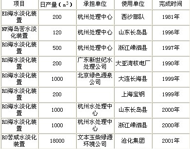 我國海水淡化技術(shù)的應(yīng)用從上世紀(jì)七十年代初推廣用小型電滲析(ED)海水淡化器開始,1981年建成了200m3/d ED淡化裝置,“九五”期間相繼建成了RO淡水裝置,多為小型或示范工程(表1), 并向馬爾代夫和基里巴斯輸出了ED和RO海水淡化裝置。