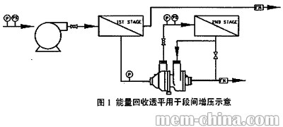 反滲透裝置脫鹽部分與或級(jí)與級(jí)之間,可使用能量回收透平,以提高下一段或級(jí)的進(jìn)水壓力,提高產(chǎn)水量。原理示意見圖1。Steven J.Duranceau等報(bào)道,1996年佛里達(dá)水服務(wù)公司在Marco島對(duì)現(xiàn)有15000m3/d苦堿水淡化進(jìn)行改造,通過使用段之間的能量回收透平,使系統(tǒng)的產(chǎn)水量增加3780m3/d,增幅達(dá)25%。