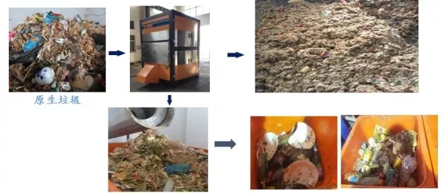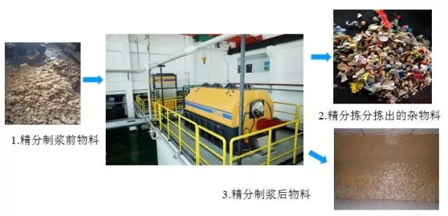 精分制漿機(jī)對物料進(jìn)行二次雜物分揀及破碎制漿,將物料中粒徑大小在20mm以上的雜物分離出系統(tǒng),如垃圾中的塑料、竹木、陶瓷、玻璃瓶、瓶蓋、筷子、骨頭以及貝殼等海鮮類硬物質(zhì)雜物,雜物外運處理。同時對大塊有機(jī)質(zhì)進(jìn)行破碎得到以有機(jī)質(zhì)8mm以下粒度的漿狀物料為主的均質(zhì)物料。