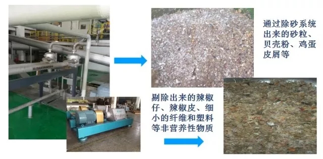 除砂裝置有效去除有機(jī)漿料中沙粒、貝殼、玻璃、瓷片、砂石等砂質(zhì)雜物,除砂后的物料經(jīng)除雜分離機(jī)分離出細(xì)纖維、塑料等輕飄物,雜物外運。