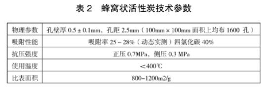 b)吸附箱采用抽屜式結(jié)構(gòu),裝填方便、便于更換。采用新型的活性炭吸附材料——蜂窩狀活性炭,與粒狀相比具有優(yōu)越的動力學(xué)性能。極適合于大風(fēng)量下使用。由于其比重為條形活性炭纖維的8-10倍,再生前吸附有機(jī)溶劑可以達(dá)到活性炭總重量的25%,具有使用壽命長,吸附系統(tǒng)運(yùn)行阻力低,凈化效率高等特點(diǎn)。蜂窩活性炭主要技術(shù)參數(shù)如表2所示: