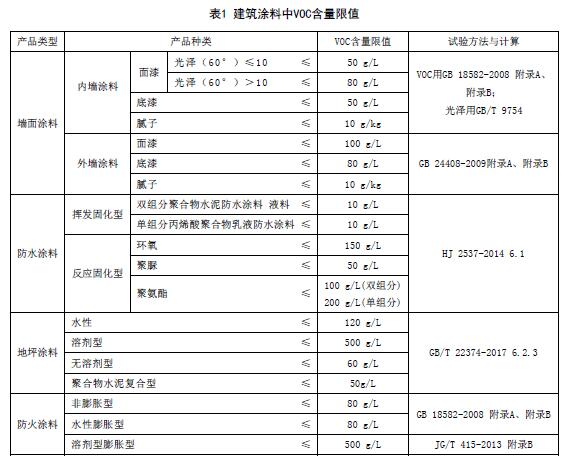 建筑涂料中VOC含量限值應符合表1的規(guī)定。