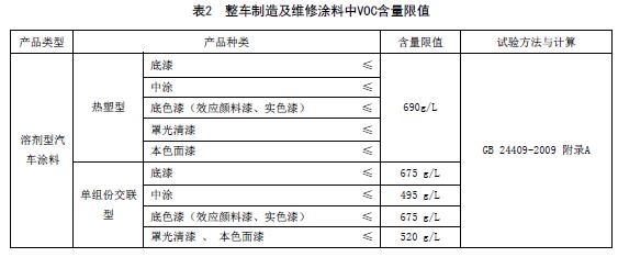 整車制造及維修涂料中VOC含量限值應符合表2的規(guī)定。