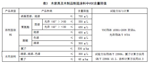 木家具及木制品制造涂料中VOC含量限值應符合表3的規(guī)定。