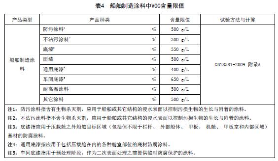 船舶制造涂料中VOC含量限值應符合表4的規(guī)定。