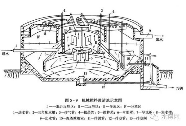 機(jī)械攪拌澄清池將混合、絮凝反應(yīng)及沉淀工藝綜合在一起,組成示意見圖5—9。池中心有一個轉(zhuǎn)動葉輪,將原水和加人藥劑及澄清區(qū)沉降下來的回流污泥混合,促進(jìn)形成較大絮體。污泥回流量是進(jìn)水量的3~5倍,為保持池內(nèi)懸浮物濃度穩(wěn)定,要及時排出多余的污泥。