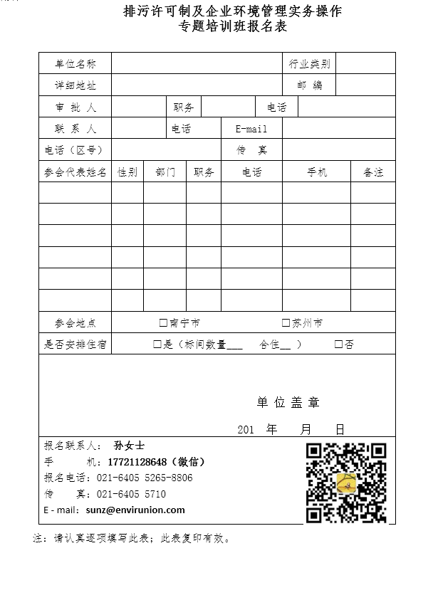附件:關(guān)于舉辦排污許可制及企業(yè)環(huán)境管理實務(wù)操作專題培訓班報名表