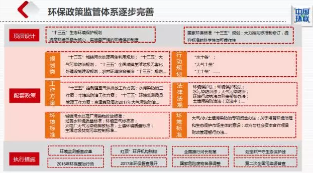 2017年以來,環(huán)保監(jiān)管體系重構(gòu):從頂層政策,如“十三五”生態(tài)環(huán)境保護規(guī)劃,到水、氣、固、土壤的配套政策,再到環(huán)保垂改、專項整治等具體措施,三位一體重構(gòu)環(huán)保政策監(jiān)管體系,強調(diào)治理效果,提升監(jiān)管力度。在責任主體、監(jiān)管體系、排污收費、排污許可、排污權(quán)交易等五個方面進行重大改革,從多個方面吸引社會力量共同改善環(huán)境質(zhì)量,把過去被動化、模糊化的管理變?yōu)榱酥鲃踊?、定量化、清晰化的管理?/p>