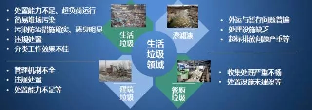 2016.1.4至2017.5.28三批中央環(huán)保督察工作中暴露了環(huán)衛(wèi)領(lǐng)域存在問題:生活垃圾處理設(shè)施不足/違規(guī)處置/隨意傾倒嚴(yán)重、簡易垃圾填埋場存在、滲濾液偷排或超標(biāo)排放嚴(yán)重、建筑垃圾管理不善、生活垃圾分類工作滯后和臭氣擾民等。