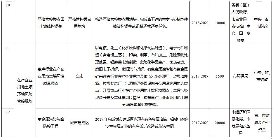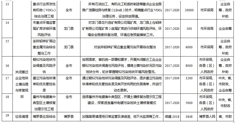 規(guī)劃從惠州市農(nóng)用地土壤分區(qū)分類管控與治理修復、在產(chǎn)企業(yè)用地土壤環(huán)境風險管控、關(guān)閉搬遷企業(yè)地塊土壤治理與修復、垃圾填埋場及周邊環(huán)境整治、工業(yè)園區(qū)風險防范、未利用地保護、土壤污染防治能力提升等方面建設(shè)6大類重點項目。其中: