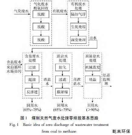 煤炭科學技術研究院有限公司針對煤化工含酚廢水提出了新型高效絡合萃取脫酚技術,并開發(fā)了專有萃取劑,出水總酚可控制在300 mg /L 以內,較國內傳統(tǒng)技術出水1 000 mg /L 有較大進步[3-6]。針對廢水回用過程中濃鹽水COD 難以脫除的問題,段鋒等[7]提出了“混凝+活性炭吸附”聯(lián)用工藝處理煤化工高含鹽廢水的工藝,可有效去除煤化工高含鹽廢水COD。針對結晶雜鹽的處置,權秋紅等[8]、陳業(yè)鋼等[9]分別提出了分鹽結晶工藝,通過蒸發(fā)結晶工藝將高濃鹽水結晶分離出純凈的NaCl 和Na2SO4,對結晶鹽進行資源化處理。筆者對煤制天然氣廢水處理各工序技術特點及存在問題進行分析,對煤制天然氣及煤化工廢水零排放處理發(fā)展趨勢進行總結與展望,以期促進煤制天然氣項目的“廢水零排放”的實現(xiàn)。