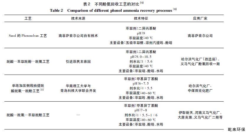 酚氨回收處理代表工藝有脫酸—萃取脫酚—脫氨工藝、脫酸—脫氨—萃取脫酚工藝、單塔加壓側線抽提( 酸性氣體、氨同塔脫除) —萃取脫酚工藝和南非薩索爾公司Phenosolvan 工藝。不同酚氨回收工藝對比見表2[10]。