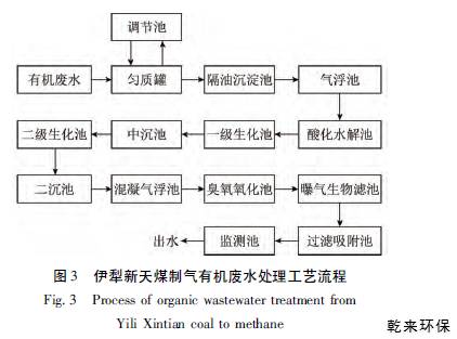 煤制氣有機廢水處理通常由“預處理+生化處理+ 深度處理”組成,該廢水主要特征是: ① 高COD,含量為3 500 mg /L; ② 高氨氮,250 mg /L 左右; ③ 有機污染物復雜,含有苯類烴、萘、多元酚、吡啶、噻吩等; ④ 毒性大,含有酚、氰化物、硫化物等有毒有害物質; ⑤ 可生化性低,BOD5 /COD( 5 日生化需氧量與化學需氧量的比值,是污水可生化降解性的指標) 在0. 3 以下。