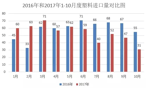 2017年1-10月國內(nèi)廢塑料進(jìn)口量為542萬噸,較2016年同期590萬噸,減少48萬噸,降幅為8.9%。