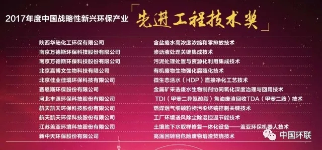 2017年下半年,中國環(huán)聯(lián)面向全國征集 “戰(zhàn)略性新興環(huán)保產(chǎn)業(yè)先進工程技術(shù)”,以企業(yè)上報資料為依據(jù),經(jīng)群眾投票與專家評審,共有10項工程技術(shù)獲得“中國戰(zhàn)略性新興環(huán)保產(chǎn)業(yè)先進工程技術(shù)獎”。