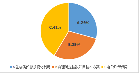 調(diào)查結(jié)果顯示,41%的受訪者認為保障電價政策是促進燃煤生物耦合發(fā)電技改試點工作的最佳方式。認為生物質(zhì)資源規(guī)?;煤秃侠泶_定技改項目技術(shù)方案的受訪者比例相當(dāng)。