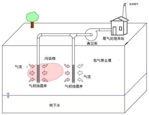 SVE系統(tǒng)一般由抽提井、真空泵、尾氣處理等幾個主要單元組成。其工作的原理如下:
