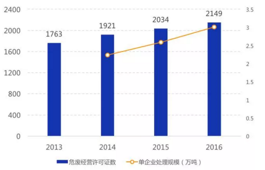 資質(zhì)企業(yè)平均規(guī)模較?。?016年我國持危險廢棄物經(jīng)營許可證的企業(yè)數(shù)量為2149家,2016年凈增加僅115家,體現(xiàn)出環(huán)保系統(tǒng)對新頒發(fā)許可證愈發(fā)謹慎;平均每家處理量僅不到3萬噸,呈現(xiàn)較強的分散性特征,但單企業(yè)處理規(guī)模由2014年2.2萬噸/年增加到2016年3.0萬噸/年,未來隨著許可證頒發(fā)與復(fù)核難度加大,實力弱、技術(shù)差的小企業(yè)將被淘汰出市場,龍頭擴張,單企業(yè)規(guī)模繼續(xù)擴大。