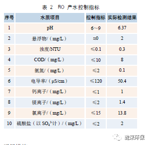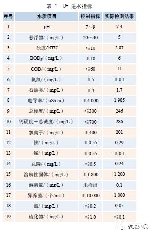 2.2.1 進水與產(chǎn)水控制指標:UF 膜進水控制指標見表 1,RO 膜產(chǎn)水控制指標見表 2。