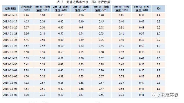 從超濾出水的 SDI 數(shù)據(jù)看,均可以控制在 2.4以下,滿足反滲透進水 SDI 不大于 4 的控制要求。從表 3 數(shù)據(jù)還可發(fā)現(xiàn),超濾出水 SDI 基本無大波動,具有良好的運行穩(wěn)定性。