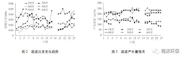 由圖 2 可看出 1# UF 和 2# UF 超濾壓差偏高,平均壓差在0.03 MPa,由于 1# UF 和 2# UF 為2012 年投用,運行周期較長,膜表面變得粗糙,膜絲斷損嚴重;3# UF~6# UF 為 2015 年 6 月投運,運行狀況良好,平均壓差在 0.018 MPa。1# UF 和2# UF 產(chǎn)水量較低,平均在 135 m3 /h,運行周期長,膜通量也降低,3# UF~6# UF 產(chǎn)水量平均在210 m3/h,均滿足設(shè)計回收率。