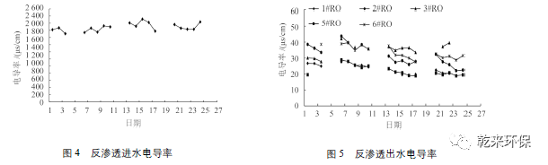 3.3 反滲透進出水電導(dǎo)率:電導(dǎo)率是反應(yīng)水中含鹽量的間接指標,因便于測定而被廣泛采用。反滲透進水和出水電導(dǎo)率變化分別見圖 4 和圖 5。