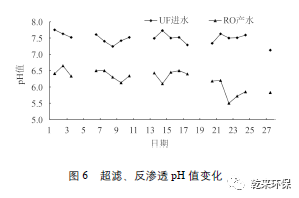 由圖 6 可以看出,隨著超濾進水 pH 值的逐步降低,其產(chǎn)水pH值亦隨之變化。當進水 pH 值在 7.1~7.8 左右時,反滲透產(chǎn)水的 pH 值在 5.8~6.5 之間波動。綜合來看,經(jīng)過反滲透處理后pH 值降低約一個單位,有時會低于 6.0。為了保證后續(xù)用水點水質(zhì)的穩(wěn)定,避免輸送管路腐蝕,可通過在產(chǎn)水中添加氫氧化鈉對pH 值進行調(diào)整,調(diào)整后回用水的 pH 值范圍為6.0~9.0。