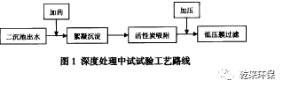 1.3工藝路線:中試試驗(yàn)裝置的處理能力為1.5m3/h,安放在現(xiàn)場(chǎng)二沉池出水附近。工藝路線為,A2/O生化系統(tǒng)處理后的二沉池出水經(jīng)過加藥后進(jìn)入絮凝沉淀反應(yīng)器,上清液進(jìn)入活性炭吸附罐,出水經(jīng)過加壓后進(jìn)入4級(jí)串聯(lián)的低壓膜過濾罐,最終得到深度處理后的廢水,如圖1所示。
