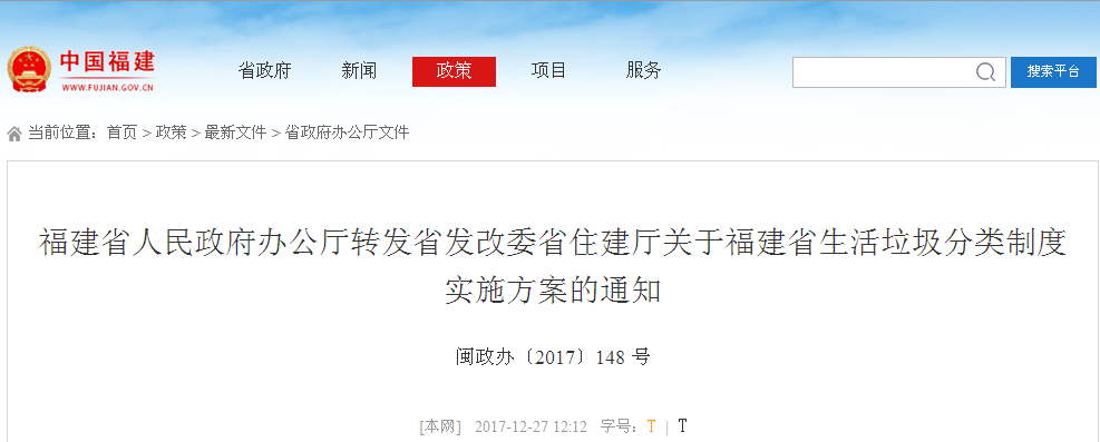 加快出臺垃圾分類實施辦法,福州市、廈門市2017年底前出臺生活垃圾分類辦法;其他設(shè)區(qū)市和平潭綜合實驗區(qū)2018年底前出臺生活垃圾分類辦法或?qū)嵤┓桨浮?/p>