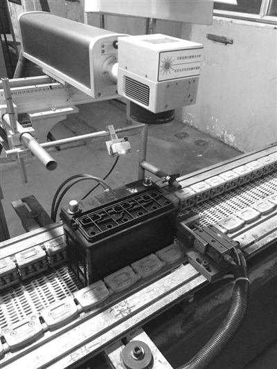 圖為鉛酸蓄電池生產基地,在全自動輸送帶上,激光打標機給全自動輸送帶上經過的一件件電池產品燙上專屬二維碼。