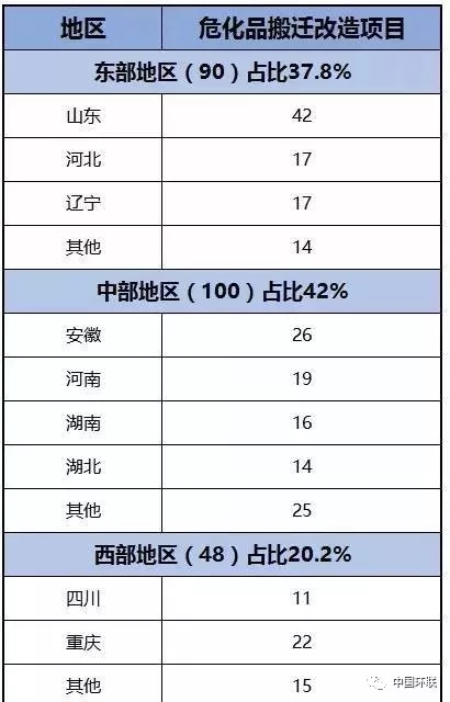 據(jù)了解,2015年,天津8·12爆炸事故發(fā)生后,工信部、國(guó)家發(fā)改委等遴選出238個(gè)?;钒徇w改造項(xiàng)目。按區(qū)域劃分,東部地區(qū)有90個(gè),占項(xiàng)目總數(shù)的37.8%,中部地區(qū)有100個(gè),占項(xiàng)目總數(shù)的42%;西部地區(qū)有48個(gè),占項(xiàng)目總數(shù)的20.2%。
