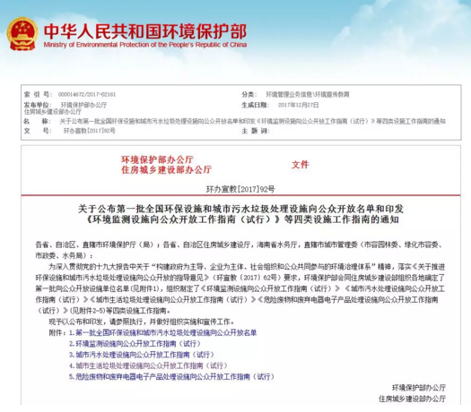 近日環(huán)保部發(fā)布了關(guān)于公布第一批全國(guó)環(huán)保設(shè)施和城市污水垃圾處理設(shè)施向公眾開(kāi)放名單和印發(fā)《環(huán)境監(jiān)測(cè)設(shè)施向公眾開(kāi)放工作指南(試行)》等四類設(shè)施工作指南的通知。