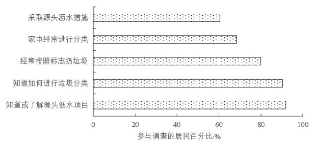 試點(diǎn)小區(qū)內(nèi)設(shè)立了生活垃圾分類督導(dǎo)員,負(fù)責(zé)日常宣傳和監(jiān)督工作。在環(huán)衛(wèi)處的協(xié)調(diào)下,組織居民到固體廢物處理終端和管理中心進(jìn)行現(xiàn)場參觀,普及生活垃圾常識,提高參與積極性。問卷調(diào)查是了解居民對垃圾分類知曉率和參與程度的有效途徑,試點(diǎn)期間在試點(diǎn)小區(qū)發(fā)放調(diào)查問卷150份,收回有效問卷124份,主要結(jié)果列于圖2。調(diào)查顯示,盡管90%以上的居民了解生活垃圾源頭瀝水和分類收集的具體要求,但是僅有60%的居民能夠按照要求采取源頭瀝水并分類投放,居民長期形成的生活習(xí)慣在短時間內(nèi)難以改變。廚余垃圾粉碎機(jī)的實(shí)際使用率約為90%,大部分居民對粉碎機(jī)的運(yùn)行效果比較滿意。綜合來看,試點(diǎn)小區(qū)約有60%的居民按要求源頭瀝水和分類投放廚余垃圾,10%的居民使用了廚余粉碎機(jī),其余30%的居民沒有真正參與。