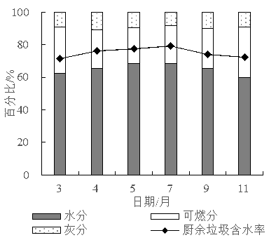 生活垃圾的三組分包括水分、可燃分和灰分(圖6),廚余垃圾平均含水率為75.24%,生活垃圾平均含水率為65.34%,且5~9月含水率最高。夏季水分含量較高的果蔬類廢棄物所占比例明顯高于其他季節(jié),導(dǎo)致廚余垃圾比例升高,含水率隨之升高。利用軟件IBM SPSS statistics 20對生活垃圾含水率和廚余垃圾含水率數(shù)據(jù)分別進(jìn)行W檢驗(yàn),在顯著性水平α=0.05條件下均滿足正態(tài)分布。二者Pearson相關(guān)系數(shù)為0.726,在0.01水平(雙側(cè))顯著相關(guān),降低生活垃圾含水率的關(guān)鍵在于降低廚余垃圾含水率。