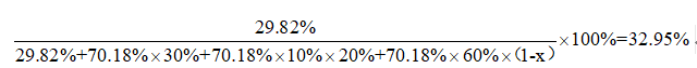 實(shí)施試點(diǎn)前,居民區(qū)生活垃圾中廚余組分為70.18%,含水率為67.82%,實(shí)施試點(diǎn)后,廚余組分為67.05%,含水率為65.34%。假設(shè)安裝粉碎機(jī)、按要求源頭瀝水和沒有參與源頭瀝水的居民所產(chǎn)生的生活垃圾物理組成相同,非廚余組分的產(chǎn)生量不變。試點(diǎn)后非廚余組分占生活垃圾的比例從29.82%提高到32.95%,利用物質(zhì)守恒定律得到如下方程式(x表示廚余垃圾減量率):