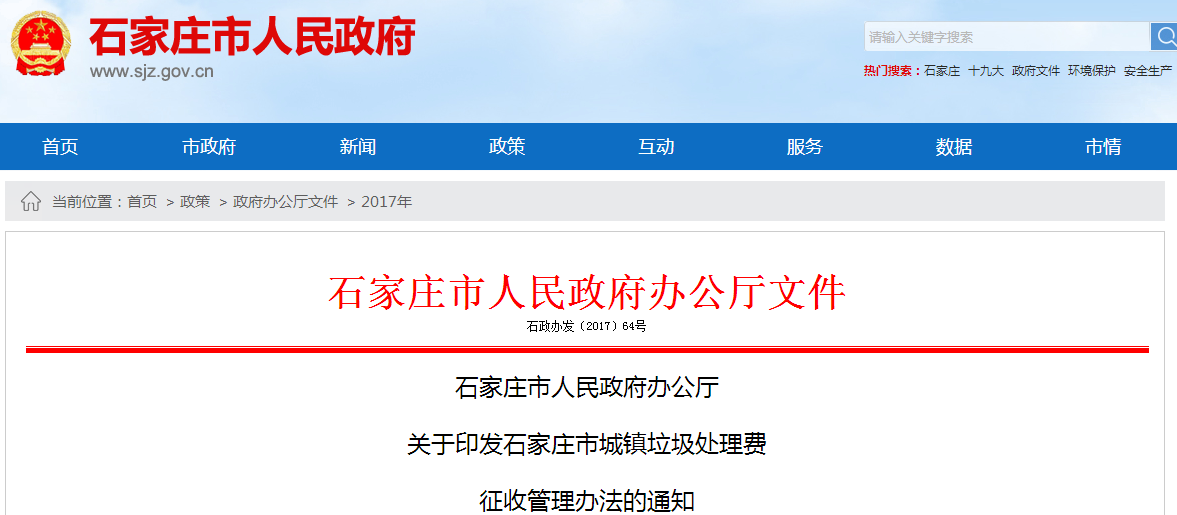 石家莊市人民政府辦公廳關(guān)于印發(fā)石家莊市城鎮(zhèn)垃圾處理費征收管理辦法的通知