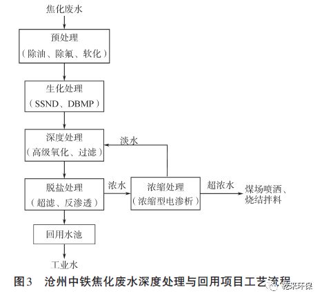 (1)預(yù)處理。4 股廢水在進(jìn)入生化系統(tǒng)前,先分別進(jìn)行預(yù)處理,低濃度焦化廢水和LNG 生產(chǎn)排水采用氣浮除油,循環(huán)排污水采用化學(xué)軟化,蒸氨廢水采用結(jié)晶除氟。其中,蒸氨廢水的氟離子含量高,在深度處理的脫鹽系統(tǒng)中易形成氟化鈣沉淀,難以化學(xué)清洗,在已往的工藝設(shè)計(jì)中經(jīng)常被忽視。項(xiàng)目采用結(jié)晶除氟反應(yīng)器,加入除氟劑,劇烈攪拌,廢水中的氟離子形成晶體沉淀得以去除,有效降低了后續(xù)脫鹽系統(tǒng)無(wú)機(jī)鹽結(jié)垢的風(fēng)險(xiǎn)。(2)生化處理。采用SSND(間歇式同步硝化反硝化工藝)和DBMP(反硝化協(xié)同生物倍增工藝)兩種工藝前后串聯(lián),作為兩級(jí)生化處理系統(tǒng)。間歇式運(yùn)行、變頻控制曝氣量,適應(yīng)焦化廢水水質(zhì)波動(dòng)大的特點(diǎn),抗沖擊能力強(qiáng)。僅憑生化處理,可使COD降低到150 mg/L以下。(3)深度處理。采用Fenton 氧化原理的均相催化氧化工藝和錳砂、多介質(zhì)兩級(jí)過(guò)濾,使出水COD≤50 mg/L,濁度≤1 NTU。(4)脫鹽處理。經(jīng)過(guò)前期的各級(jí)處理,脫鹽工藝可長(zhǎng)期穩(wěn)定運(yùn)行,產(chǎn)水直接回用于工業(yè)水系統(tǒng),濃水進(jìn)入濃縮處理系統(tǒng)。(5)濃縮處理。采用濃縮型電滲析對(duì)反滲透濃水進(jìn)行再濃縮,提高凈水回收率,最大限度地減少濃水產(chǎn)生量,超濃水用于煤場(chǎng)噴灑和燒結(jié)拌料。