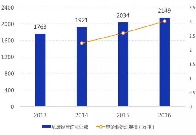 資質(zhì)企業(yè)平均規(guī)模較?。?016年我國(guó)持危險(xiǎn)廢棄物經(jīng)營(yíng)許可證的企業(yè)數(shù)量為2149家,2016年凈增加僅115家,體現(xiàn)出環(huán)保系統(tǒng)對(duì)新頒發(fā)許可證愈發(fā)謹(jǐn)慎;平均每家處理量?jī)H不到3萬(wàn)噸,呈現(xiàn)較強(qiáng)的分散性特征,但單企業(yè)處理規(guī)模由2014年2.2萬(wàn)噸/年增加到2016年3.0萬(wàn)噸/年,未來(lái)隨著許可證頒發(fā)與復(fù)核難度加大,實(shí)力弱、技術(shù)差的小企業(yè)將被淘汰出市場(chǎng),龍頭擴(kuò)張,單企業(yè)規(guī)模繼續(xù)擴(kuò)大。