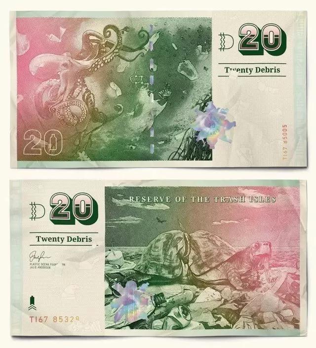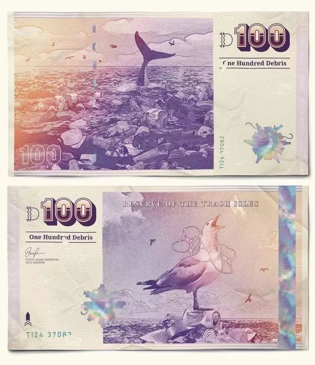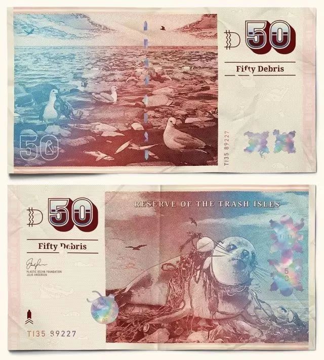 其他國家的貨幣都是領(lǐng)導(dǎo)人或風(fēng)景名勝,垃圾群島共和國的貨幣則獨(dú)樹一幟,均是動物遭受海洋垃圾迫害的慘烈場景。