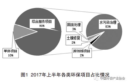 2017年上半年(截至2017年6月30日的數(shù)據(jù),下同),環(huán)境綜合治理項目出現(xiàn)爆發(fā)式增長,樣本上市公 司披露各類中標(biāo)、簽約項目92項,占上半年披露項目總數(shù)的51%,投資總額約1470億元,占上半年披露項目投資總額的89.5%,成為推動環(huán)保市場增長的主要因素。其中,受“河長制度”( 2016年12月,中中央辦公廳、國務(wù)院辦公廳印發(fā)《關(guān)于全面推行河長制的意見》,要求2018年底前全面建立河長制,實現(xiàn)省、市、縣、鄉(xiāng)四級主要領(lǐng)導(dǎo)對水環(huán)境質(zhì)量直接負(fù)責(zé))和PPP(政府與社會 資本合作模式)政策的雙重推動,水環(huán)境綜合治理項目增長最多,項目總投資約1365億元;固廢綜合治理項目總投資約43億元;土壤污染綜合治理項目26億元。2017年上半年各類環(huán)保項目占比情況如圖1。