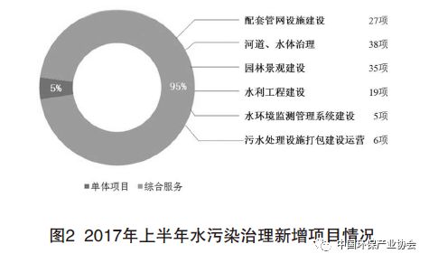 從2017年上半年的環(huán)保上市公司披露項目來看,114個水污染治理項目中,36個單體項目,投資總額 65億元;78個綜合治理項目投資總額達(dá)1364億元。其中,包含配套管網(wǎng)設(shè)施建設(shè)內(nèi)容的項目27個;包含河道水體治理內(nèi)容(指河道清淤、黑臭水體治理等內(nèi)容)的項目38個;包含園林景觀建設(shè)內(nèi)容的項目35個;包含水利工程建設(shè)內(nèi)容的項目19個;包含水環(huán)境監(jiān)測、管理系統(tǒng)建設(shè)內(nèi)容的項目5個。以北控水務(wù)同中建一局聯(lián)合中標(biāo)的包頭市城市水生態(tài)提升綜合利用PPP項目為例,該項目集全城域的水利防洪工程、水資源調(diào)配工程、河湖水網(wǎng)連通工程、城市景觀水系工程以及智慧水務(wù)管理工程為一體,估算靜態(tài)總投資達(dá)196億元。2017年上半年水污染治理新增項目情況如圖2。