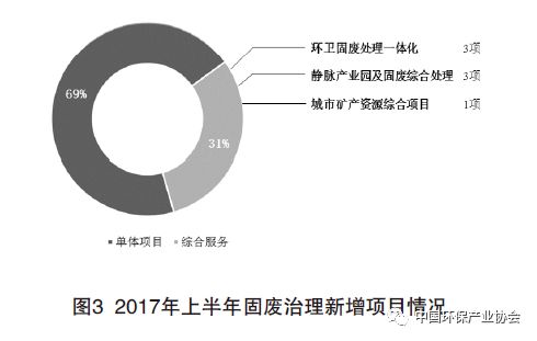 從2017年上半年環(huán)保上市公司披露的項目來看,42個固廢處理項目中,35個單體項目,投資總額97億元;7個綜合項目投資總額43億元。其中,環(huán)衛(wèi)固廢處理一體化項目3個,固廢綜合處理及靜脈產(chǎn)業(yè)園建設(shè)3個。以中國天楹中標(biāo)的寧夏固原市循環(huán)經(jīng)濟(jì)產(chǎn)業(yè)園及環(huán)衛(wèi)一 體化項目為例,該項目披露總投資15億元,包含生活垃圾焚燒發(fā)電BOT項目(30年)、餐廚垃圾處置BOT項目(30年)、污泥干化BOT項目(30年)、建筑垃圾循環(huán)利用項目(30年)以及城鄉(xiāng)環(huán)衛(wèi)一體化項目(30年)。 2017年上半年固廢治理新增項目情況如圖3。