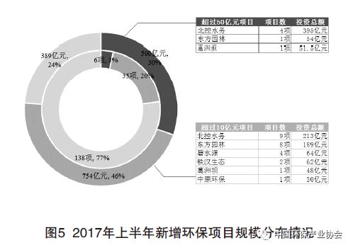 在環(huán)境治理市場向綜合服務(wù)升級的趨勢下對環(huán)保企業(yè)的資金、技術(shù)、資源調(diào)配能力要求越來越高,環(huán)保企業(yè)之間的拿單能力開始分化。上半年大型綜合治理項目主要集中在北控水務(wù)、東方園林、碧水源、國禎環(huán)保等少數(shù)幾個環(huán)保企業(yè)手中。6個超過50億元的項目,分別來自北控水務(wù)(4項)、東方園林(1項)、葛洲壩(1 項)。項目投資額在10億~50億元之間的35個項目中, 北控水務(wù)、東方園林、碧水源獲得21項。2017年上半年新增環(huán)保項目規(guī)模分布情況如圖5。