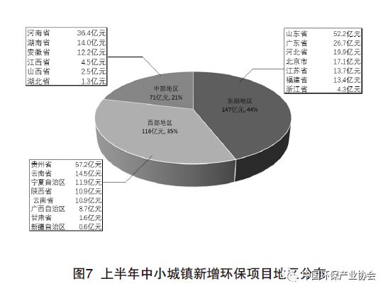 從地域分布來看,貴州、山東、河南、廣東等省市中小城鎮(zhèn)環(huán)保項目總投資額較大??傮w來看,東部地區(qū) 中小城鎮(zhèn)環(huán)保市場活躍,投資額占比超過44.1%,中部地區(qū)占比21.2%,西部地區(qū)占比34.8%。2017年上半年中小城鎮(zhèn)新增環(huán)保項目地區(qū)分布見圖7。
