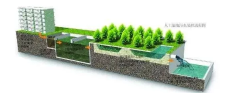 人工濕地的一般工藝流程包括預處理、水生植物池和集水排水3大部分。
