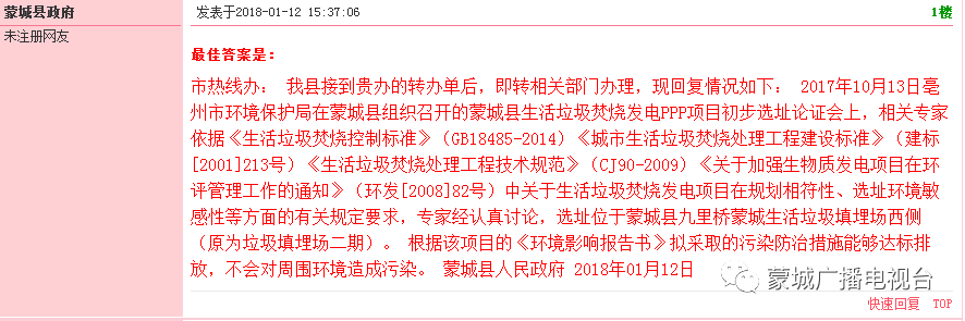 市熱線辦: 我縣接到貴辦的轉(zhuǎn)辦單后,即轉(zhuǎn)相關(guān)部門辦理,現(xiàn)回復(fù)情況如下: 2017年10月13日亳州市環(huán)境保護(hù)局在蒙城縣組織召開的蒙城縣生活垃圾焚燒發(fā)電PPP項(xiàng)目初步選址論證會(huì)上,相關(guān)專家依據(jù)《生活垃圾焚燒控制標(biāo)準(zhǔn)》(GB18485-2014)《城市生活垃圾焚燒處理工程建設(shè)標(biāo)準(zhǔn)》(建標(biāo)[2001]213號(hào))《生活垃圾焚燒處理工程技術(shù)規(guī)范》(CJ90-2009)《關(guān)于加強(qiáng)生物質(zhì)發(fā)電項(xiàng)目在環(huán)評管理工作的通知》(環(huán)發(fā)[2008]82號(hào))中關(guān)于生活垃圾焚燒發(fā)電項(xiàng)目在規(guī)劃相符性、選址環(huán)境敏感性等方面的有關(guān)規(guī)定要求,專家經(jīng)認(rèn)真討論,選址位于蒙城縣九里橋蒙城生活垃圾填埋場西側(cè)(原為垃圾填埋場二期)。