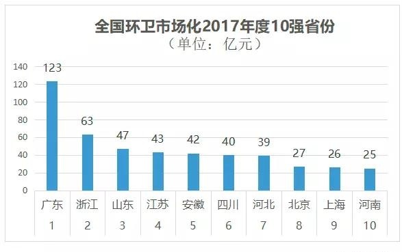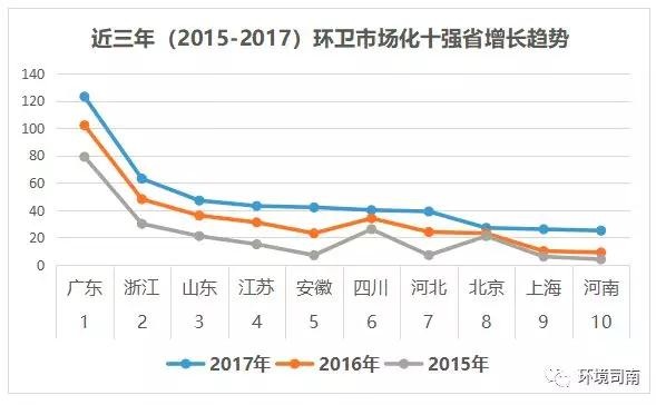 正基于此,一些人口大省和經(jīng)濟(jì)大省近年來受到環(huán)衛(wèi)企業(yè)的追捧,在環(huán)衛(wèi)市場(chǎng)化方面實(shí)現(xiàn)了跳躍式發(fā)展。比如河北省的環(huán)衛(wèi)市場(chǎng)化份額從2015年的7億,到2016年的24億,再到2017年的39億;河南省的環(huán)衛(wèi)市場(chǎng)化份額從2015年的4億,到2016年的9億,再到2017年的25億;安徽省的環(huán)衛(wèi)市場(chǎng)化份額從2015年的7億,到2016年的23億,再到2017年的42億……