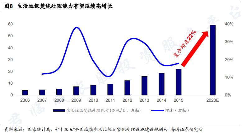 根據(jù)十三五規(guī)劃,2020年垃圾焚燒處理能力要達(dá)到59.1萬噸/日,這是一個(gè)年復(fù)合增長率為20%的快速成長行業(yè)。
