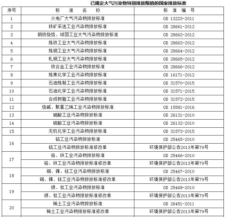附件:已規(guī)定大氣污染物特別排放限值的國家排放標(biāo)準(zhǔn)